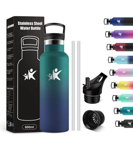 ¿500ML STAINLESS STEEL WATER BOTTLE: Don't rely on cheap plastic water bottles that can burst, our insulated bottle is made from durable materials, making it a bottle that will withstand your most intense workouts! The KollyKolla 500ml bottle is reusable and easy to clean. It is ideal for various occasions - whether in the office, school or for children's sports activities.¿ 2 Lids for Replacement: (1) Straw Lid: It allows you to easily drink water/drinks without removing the lid, which is suitable for sports and outdoor activities. (2) Handle Cap: This cap comes with a carrying ring and filter. It can block tea, fruit and ice cubes, etc. Note: The filter should be used with the lid or the lid cannot fit in the mouth of the bottle.¿ 100% BPA FREE MATERIAL: Cheap plastic bottles release harmful chemicals, altering the taste of your drinks when filling. With the KollyKolla stainless steel bottle, enjoy the benefits of high-quality 18/8 stainless steel, which has antioxidant and corrosion resistant properties. It is free from phthalates, lead and other harmful substances for a healthy drinking experience.¿Vacuum Insulation: The advanced double-walled design of the 500ml insulated bottle keeps your drinks at the ideal temperature for hours. Enjoy your drinks at the ideal temperature, whether in hot summer or cold winter. And even soft drinks stay fresh!.¿ Versatile use: The 500 ml insulated bottle impresses with its practical and well thought-out design. With its moderate volume, it fits easily into any cup holder, backpack or even in the side pocket of your handbag. Whether you're on the way to work, a short hike or just out on a city trip, this bottle is the perfect companion for any occasion. ...