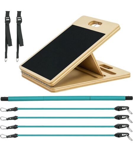 VERSATILE TRAINING OPTIONS: This Pilates bar kit equipped with resistance bands promotes a variety of exercises that increase flexibility, reduce excess fat, and form aesthetic muscle lines all over the body, including stretching before and after workout.MODULABLE RESISTANCE: Includes six elastic bands and two additional bands, which can be used alone or in combination, allowing you to adapt the resistance to your strength and specific training requirements.ADJUSTABLE STRETCHING BOARD: Base transforms into a stretching board with three adjustable angles, perfect for stretching calves and ankles, making it an effective tool to alleviate your pain and optimize your workout.Compact and practical: our Pilates bar set, designed for spatial efficiency, can be easily assembled and disassembled with buckles, making it easy to carry for exercise sessions at home, office or outdoors.STURDY AND ANTI-SLIP DESIGN: Made of steel covered with soft, sweat-absorbing foam, our Pilates bar ensures a secure and comfortable grip, while the wooden sloped board ensures increased durability ...