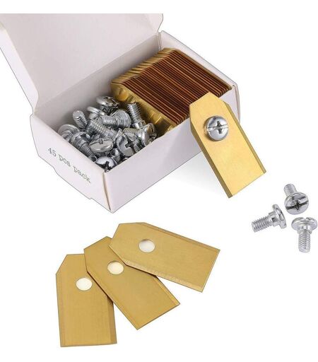 The blade set has been made of quality stainless steel and has an additional titanium carbide coating.Color: Gold Size: 35 * 18 * 0.75mm Package Content: 45 screws and 45 blades included.Our knife blade kit is sharp, low commission rate, improve installation and production efficiency Yield.qtiwe mähroboter replacement blades for all husq varn for MOWER ROBOT Yardf reinforced and GARDENA.Models/types: 105, G1, Solar Hybrid 220 AC 230 ACX, 260 ACX 265 ACX 305 308 310 315 320 330 x 420, 430 x 440 450 x r38li R40Li r45li 50li r7 0Li r75li r80li r100li r130li r160li r165 r180 Sileno Smart Sileno Sileno + sc600, SC 600 ECO, SC 900 ...