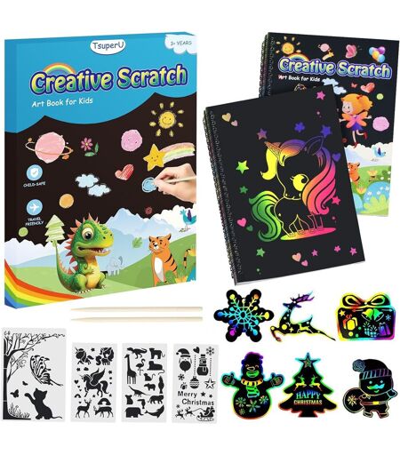 INSPIREZ L'IMAGINATION ET LA CRÉATIVITÉ : L'ensemble de livres d'art à gratter est livré avec 4 modèles de règles de dessin avec des licornes, des dinosaures, des élans, des girafes, des fleurs, des papillons, des chats, le Père Noël, des flocons de neige, des bonshommes de neige, des arbres de Noël, des scènes d'animaux et de plantes, vous pouvez les mélanger et les assortir selon vos propres préférences, vous pouvez concevoir de nombreux types de paysages beaux et émouvants.L'ART ET L'ARTISANAT POUR LES ENFANTS : TsuperU scratch art kit peut vous aider à inspirer la créativité de votre enfant, il n'y a pas de limite, peut être utilisé comme jouets pour filles, l'artisanat de fête, peut améliorer la créativité et l'art des filles et des garçons. Parfait pour réduire leur exposition à la télévision et aux jeux vidéo et passer plus de temps à les inspirer. Il est facile de créer des heures de jeu amusant et fait un jouet de calendrier de l'Avent amusant et un cadeau.Cadeaux personnalisés pour garçons et filles : kit de peinture avec une belle boîte cadeau, convient aux cadeaux licornes pour les 4 5 6 7 8 9 ans, cadeaux de Noël, cadeaux d'anniversaire, cadeaux de fête des enfants, cadeaux de Thanksgiving, cadeaux de Nouvel An, cadeaux de Saint-Valentin, Cadeau Secret Santa, cadeaux de Pâques, cadeaux de couture, cadeaux d'entrée à l'école, convient également aux filles, fils, petites-filles, petits-fils, nièces et neveux, jouets licornes sacs de fête.LIVRE À GRATTER MAGIQUE : Grattez le papier noir à l'aide du stylet en bambou pour révéler le monde coloré qui se cache en dessous, libérez votre créativité et découvrez des possibilités créatives infinies pour un monde magique de couleurs. Le livre à gratter est petit et délicat, parfait pour toutes sortes de voyages, vous apportant des heures de créativité et d'amusement. C'est le cadeau idéal pour les enfants de 3 à 8 ans qui aiment dessiner.ENSEMBLE D'ART À GRATTER AMUSANT : Comprend un livre d'art à gratter, 6 cartes modèles, 4 règles à outils, 2 stylets en bambou dans une belle boîte. C'est une excellente activité artistique et artisanale pour les filles et les garçons âgés de 3 à 10 ans, invitez votre famille ou vos amis à se joindre à la conception facile et amusante. Rendez votre enfant plus mignon et charmant pour les anniversaires, les fêtes, Noël, le Nouvel An, les anniversaires, les calendriers de l'Avent et plus encore ...