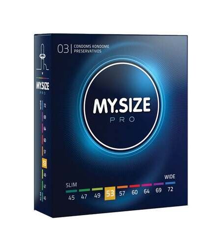My.Size Pro (https://www.espaceplaisir.fr/marques/428-mysize-pro) est une marque de préservatifs parfaitement adaptés à votre taille de pénis ! Profitez de rapports sexuels en toute sécurité et dans le plus grand des conforts grâce à ces préservatifs disponibles en plusieurs tailles. Plusieurs études ont démontré que les préservatifs standards, pour beaucoup d'hommes, sont trop serrés ou trop larges. My.Size Pro a remédié à ce problème en vous permettant de trouver le préservatif qu'il vous faut parmi leurs produits. À l'aide d'un ruban mesurable, déterminez la circonférence de votre pénis et procurez-vous la boîte de préservatifs parfaitement adaptée à votre taille ! Les Préservatifs Taille 53 Boîte de 3 ont une largeur de 53 mm à plat et sont idéaux pour les pénis d'une circonférence de 10,5 à 11 cm environ. Ces préservatifs ont une épaisseur de 50/60 microns, ils sont donc très fins et vous permettent de profiter de sensations naturelles pendant vos rapports, pour plus de plaisir ! Conçus en latex de caoutchouc naturel déproténéïsé, le Vytex, ces préservatifs sont totalement vegan. Le Vytex est un matériau alternatif aux synthétiques qui vous permet de profiter de préservatifs en latex naturel, pour le bien de votre corps et de votre planète. Ces préservatifs sont lubrifiés, dotés d'un réservoir et sans impuretés allergènes. Leur odeur est légère et agréable. Découvrez aussi la boîte de 10 et la boîte de 36 préservatifs ! Pour une utilisation optimale et en toute sécurité de vos préservatifs, espaceplaisir vous recommande d'utiliser un lubrifiant à base d'eau, de plus les sensations n'en seront que bonifiées. ...