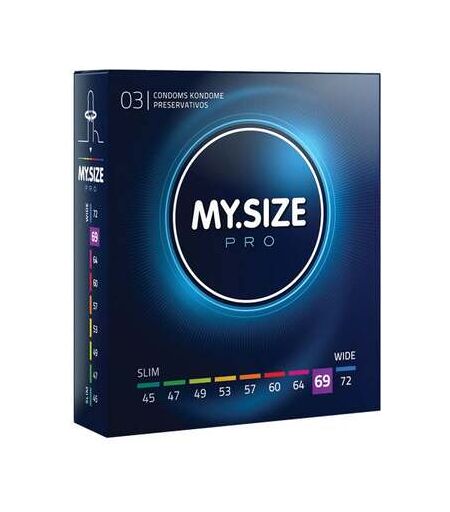 My.Size Pro (https://www.espaceplaisir.fr/marques/428-mysize-pro) est une marque de préservatifs parfaitement adaptés à votre taille de pénis ! Profitez de rapports sexuels en toute sécurité et dans le plus grand des conforts grâce à ces préservatifs disponibles en plusieurs tailles. Plusieurs études ont démontré que les préservatifs standards, pour beaucoup d'hommes, sont trop serrés ou trop larges. My.Size Pro a remédié à ce problème en vous permettant de trouver le préservatif qu'il vous faut parmi leurs produits. À l'aide d'un ruban mesurable, déterminez la circonférence de votre pénis et procurez-vous la boîte de préservatifs parfaitement adaptée à votre taille ! Les Préservatifs Taille 69 Boîte de 3 ont une largeur de 69 mm à plat et sont idéaux pour les pénis d'une circonférence de 13,5 à 14,5 cm environ. Ces préservatifs ont une épaisseur de 50/60 microns, ils sont donc très fins et vous permettent de profiter de sensations naturelles pendant vos rapports, pour plus de plaisir ! Conçus en latex de caoutchouc naturel déproténéïsé, le Vytex, ces préservatifs sont totalement vegan. Le Vytex est un matériau alternatif aux synthétiques qui vous permet de profiter de préservatifs en latex naturel, pour le bien de votre corps et de votre planète. Ces préservatifs sont lubrifiés, dotés d'un réservoir et sans impuretés allergènes. Leur odeur est légère et agréable. Découvrez aussi la boîte de 10 et la boîte de 36 préservatifs ! Pour une utilisation optimale et en toute sécurité de vos préservatifs, espaceplaisir vous recommande d'utiliser un lubrifiant à base d'eau, de plus les sensations n'en seront que bonifiées. ...