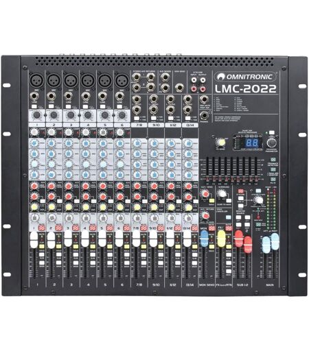 Note: Les articles du la catégorie des ventes sont des restes ou de articles provenant de retours de clients.Ces articles ne sont disponibles qu', en quantités limitées, entièrement fonctionnels mais en partie sans emballage d', origine.Si vous avez des questions sur le produit illustré ici, veuillez nous contacter avant votre achat afin d', éviter toute divergence éventuelle. Nous nous ferons un plaisir de vous informer.: Remarques concernant le produit: Article avec des signes d'usure: Consoles de mixage live professionnelles avec égaliseur britannique, unité FX et interface USBLa série LMC d'OMNITRONIC permet d'obtenir facilement le bon son ! Ces consoles de mixage incroyablement conviviales offrent un son chaud et naturel grâce à des paramètres audio exceptionnels, un large éventail de fonctions et une fiabilité maximale. Elles sont idéales pour les enregistrements professionnels en studio, les spectacles en direct et les installations de sonorisation fixes. La 2022FX, en particulier, dispose de plusieurs fonctions utiles sans équivalent dans cette gamme de prix: système de détection de larsen, annulateur de voix et effet surround stéréo 3D.Tous les canaux mono sont dotés de préamplis microphones haut de gamme à très faible bruit, offrant une plage dynamique extraordinaire de 130 dB et une bande passante allant de moins de 10 Hz à plus de 200 kHz pour une reproduction cristalline du signal. Les égaliseurs incroyablement chauds et naturels utilisés pour toutes les bandes de canaux sont basés sur les circuits classiques "British EQ" des consoles de mixage des années 60 et 70. En outre, votre console de mixage de la série LMC dispose d'un compresseur de qualité studio avec une fonctionnalité simple à un bouton sur chaque canal mono, ainsi que d'un processeur FX 24 bits avec 16 effets modifiables qui peuvent être ajoutés aux canaux individuels, aux bus ou au mixage principal. Grâce à l'interface audio USB intégrée avec une fréquence d'échantillonnage allant jusqu'à 48 kHz, vous pouvez relier votre ordinateur Windows ou Mac et enregistrer vos sessions instantanément.Mélangeur audio PRO avec égaliseur, compresseur, unité d'effet et interface USB de style britannique 6 canaux d'entrée mono avec contrôle de gain, égaliseur 3 voies avec bande médiane semi-paramétrique, coupe-bas et contrôle panoramique, 6 inserts pour une connexion flexible de l'équipement externe sur chaque canal mono, 4 canaux d'entrée stéréo avec égaliseur 4 voies, sélection du niveau et contrôle de la balance, Préamplis micro ultramodernes à faible bruit avec une plage dynamique de 130 dB et une grande marge de manœuvre, Des égaliseurs britanniques exceptionnels pour un son chaleureux et musical, Compresseurs de qualité studio avec fonctionnalité simple d'un bouton et LED de contrôle sur chaque canal mono, Unité d'effets DSP 24 bits avec 16 préréglages éditables, fonction tap et paramètres utilisateur mémorisables, L'interface audio USB intégrée permet d'enregistrer et de lire des... ...