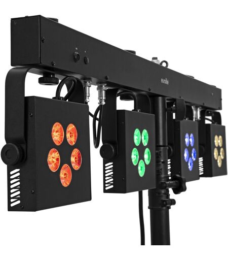 Barre avec 4 spots RGB/WW puissants, prise en charge QuickDMX, télécommande IR et sac de transport 5 LED puissantes 7 W haute puissance 4 en 1 QCL RGB/WW (mélange homogène des couleurs)spots contrôlés séparément, Barre transversale avec unité de commande DMX intégrée et embout TV pour installation sur trépied, Avec un angle de faisceau de 16°, 20 programmes de spectacles intégrés, Mélange de couleurs en continu, variateur électronique, sélection de programmes, Points de fixation et prises électriques pour appareils supplémentaires, Contrôle via DMX, autonome, son vers lumière via microphone, télécommande IR, pédale sans fil (en option), QuickDMX via USB (en option), W-DMX par solution sans fil via USB (en option), CRMX par LumenRadio via USB (en option), Pour les domaines d'application tels que: utilisation mobile, scène, DJ / animateurs mobiles, petite location, location, Préprogrammé dans EASY SHOW 1, LED EASY OPERATOR DELUXE, Light Captain, EASY SHOW 2, Light´J, EASY SHOW 3, Colorchief, Entrée et sortie secteur pour le raccordement électrique de 8 unités maximum, Très silencieux pendant le fonctionnement, Possibilité d'application: Suspendu, sur pied, Contenu de l'emballage 1 x effet lumineux, 1 x manuel d'utilisation, 1 x cordon d'alimentation, 1 x télécommande, 1 x pile, 2 x support oméga, 1 x déclaration de conformité, 4 x vis moletées, 1 x sac, Alimentation électrique: 100-240 V CA, 50/60 Hz, Consommation électrique: 125 W, Classification IP: IP20, Connexion électrique: Alimentation secteur via P-Con (bleu), cordon d'alimentation pour version encastrable avec fiche de sécurité (fourni), Longueur du câble: 3 m, Puissance de sortie: 2 connecteurs IEC (F) version à montage1 x P-Con (gris), version à montage, Fusible de l'appareil: 5 x 20 mm, fusible T 2 A remplaçable, Fusible de sortie de puissance par canal: 5 x 20 mm, fusible T 5 A remplaçable, Batterie: 1 pile bouton 3,0 V CR2025 au lithium-manganèse intégrée, Type de lampe: lampe LED, Type de LED: 5 x 7 W haute puissance 4 en 1 QCL RGB/WW (mélange homogène des couleurs), Canaux DMX: 3, 4, 6, 8, 16, 20, 18, Entrée DMX: Version à montage XLR 3 broches (M), Sortie DMX: Version à montage XLR 3 broches (F), Refroidissement: Refroidissement par convection passive, Contrôle: DMX, autonome, son vers lumière via microphone, télécommande IR, pédale sans fil (en option), QuickDMX via USB (en option), W-DMX par solution sans fil via USB (en option), CRMX par LumenRadio via USB (en option), Préprogrammé dans: EASY SHOW 1, LED EASY OPERATOR DELUXE, Light Captain, EASY SHOW 2, Light´J, EASY SHOW 3, Colorchief, Angle du faisceau: 16°, Angle du faisceau (1/2 crête): 16°, Angle du faisceau (1/10 pic): 32°, Couleur du boîtier: Noir, Système de fixation: Raccord TV Ø 28 mmSupport Omega, Dimensions: Largeur: 108 cmProfondeur: 6 cmHauteur: 28 cm, Poids: 9,80 kg, Classification du bruit: Classe 1 (bruit très faible, adapté aux environnements sensibles au bruit), Spécifications légales, Produit spécial: Non... ...