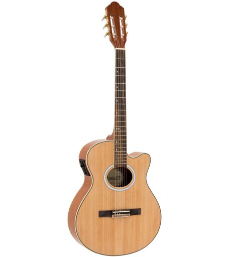 Guitare classique 4/4 Contenu de l'emballage 1 x instrument, 1 x pile, 1 x clé hexagonale, Batterie: 1 pile 9,0 V E bloc 6F22 zinc-carbone intégrée, Cou: Acajou,Touche: noyer, Corps: 4/4 Forme en coupeacajou, Longueur de l'échelle: 650 mm, Largeur de la noix: 43 mm, Pont: Érable, Nombre de cordes: 6, Égaliseur: 1 x contrôle de tonalité à 3 bandes, Haut: épicéa, Couleur: Nature, Poids: 2,00 kg ...