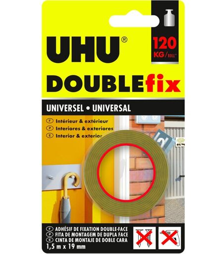 Doublefix Universel - Ruban adhésif double face , ultra fort, résistance à 120 Kg, blanc, rouleau de 1,50 m x 19 mm - UHU
