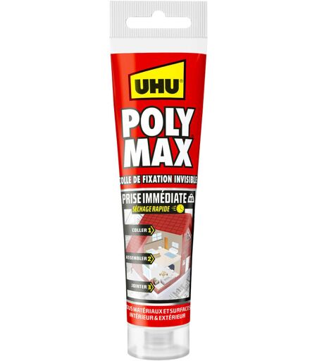 UHU - Polymax prise immédiate- Mastic/colle msp pour coller, assembler et jointer, toutes surfaces, ultra solide, sans solvants, blanc, tube 165 g