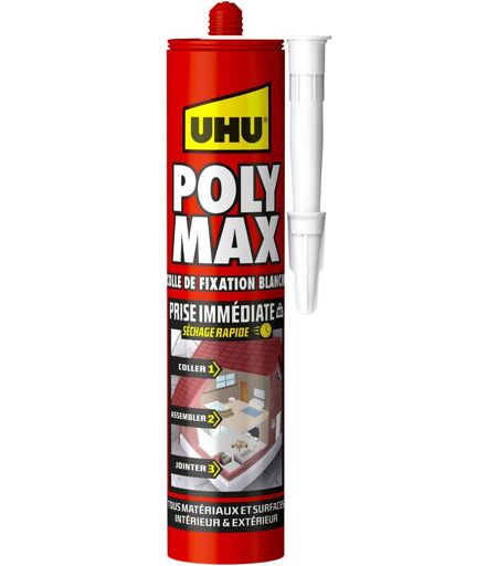 UHU - Polymax prise immédiate- Mastic/colle msp pour coller, assembler et jointer, toutes surfaces, ultra solide, sans solvants, blanc, cartouche 425