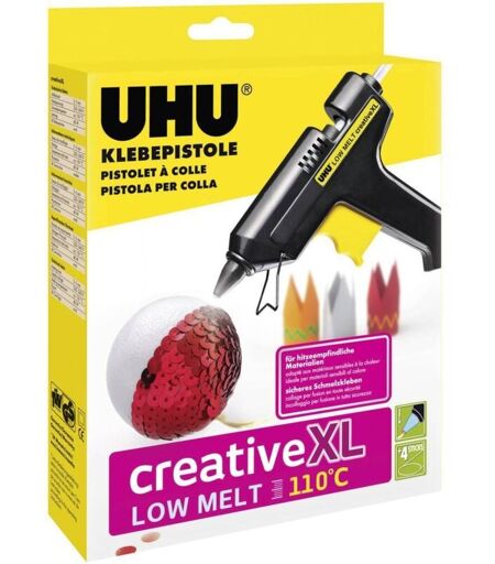 Informations techniques Débit (max.) : 7.3 g/min Puissance : 40 W Temps de chauffage (max.) : 300 s Température de fusion : 110 °C Tension de fonctionnement : 220 - 240 V Ø baton de colle : 11 mm Pistolet à colle 11 mm 40 W 220 - 240 V Le pistolet à colle UHU Creative XL LOW MELT 110°C est un pistolet à colle basse température. Le pistolet à colle compatible fonctionne avec une température de fusion réduite de seulement environ 110 °C et colle donc même des matériaux sensibles à la chaleur comme le Styropor® et le PVC souple, rapidement, proprement et fiablement. Une courte phase de préchauffage et une avance mécanique pour les cartouches de colle permettent une alimentation en colle continue et un travail sans fatigue. Le pistolet à colle UHU CREATIVE XL LOW MELT 110 °C est compatible uniquement avec les cartouches de colle UHU ovales LOW MELT 110 °C. Avec sa capacité de fusion élevée, il est idéal pour le bricolage, la décoration, les conceptions créatives et les réparations. Points ...
