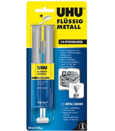 UHU liquid metal est une colle à base de résine époxy bicomposante haute performance, de couleur métallique, pour le collage haute résistance du métal et des alliages métalliques (acier, aluminium) également en combinaison avec le bois, le porcelaine, le grs, la cramique et une varit de plastiques. UHU liquid metal convient galement pour la rparation et le remplissage des espaces mtalliques. ...