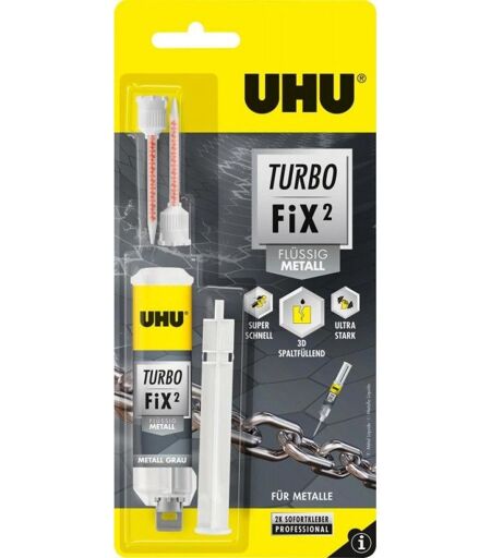 UHU TURBO FIX ² FLÜSSIG METALL adhésif de réparation rapide à 2 composants basé sur Cyanacrylatbasis Extrêmement forte, rapide et de remplissage fractionné Aussi pour les zones inégales Gel-consistance, pour une application sans gouttes Pour toutes sortes de travaux de montage et de réparation avec une grande variété de métaux Gris métal Sans solvant Étanche Peinture, perçage et rectification Remplissage des gend: jusqu'à 5 mm (supplément encore) Résistant à la température:-40 ° c/+ 80 ° C (jusqu'à + 120 ° C à court terme) ...