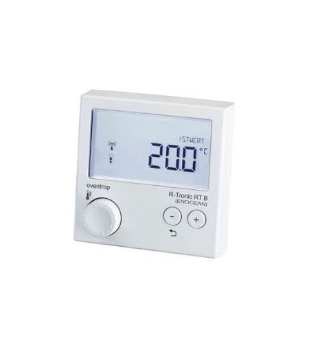 Oventrop R Tronic RT B unité de commande radio 1150780 avec 5 profils EnOcean sélectionnables fonctionnant sur batterie prend en charge le profil d'équipement EnOcean (EEP) A5-10-02 A5-10-03 A5-10-04 Télégrammes A5-10-06 et RPS et peut être connecté à des centres de contrôle/passerelles (par exemple avec le kit de base « OVbalance Home ») via la navigation dans les menus La température de consigne et la température réelle de la pièce sont affichées sur l'écran ...