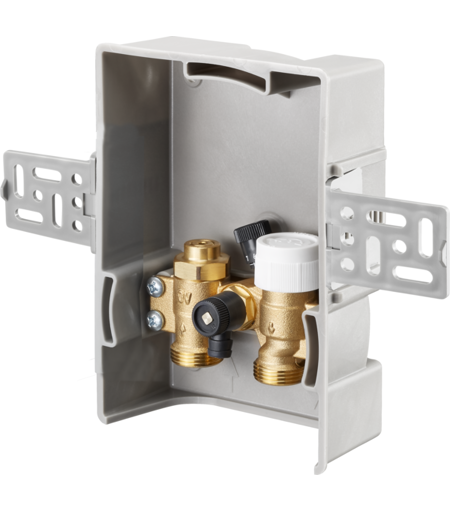 Oventrop Unibox contrôle de la température ambiante 1022725 pour une utilisation dans des installations avec des températures de départ adaptées au chauffage des panneaux se composant de: boîtier mural avec vanne thermostatique avec tige de dérivation intégrée et insert de régulation Vanne de purge et de rinçage Couvercle avec isolation de vanne thermostatique intégrée pour fonctionnement avec non agressif liquides inoffensifs Max. Pression de service ps: 10 bar Température de fonctionnement ts: 2-100 ° C Plage de consigne: 7-28 ° C (température ambiante) Vanne avec raccord de tuyau G 3/4 selon DIN EN 16313 (Eurocone) ...