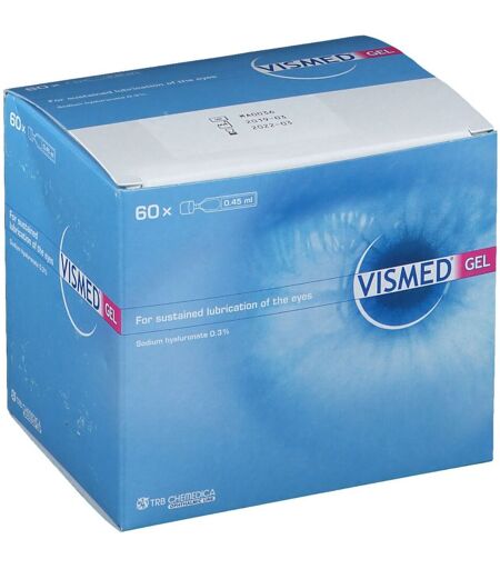 VISMED® GEL contient du hyaluronate de sodium, un polymère naturel également présent dans les structures de l’œil humain. Les caractéristiques physiques particulières du hyaluronate de sodium confèrent à VISMED® GEL ses propriétés viscoélastiques et de rétention d’eau. VISMED® GEL forme ainsi un film stable à la surface de l’œil qui n’est que très lentement éliminé par le battement des paupières. VISMED® GEL allie ainsi un effet prolongé à un confort maximal. En raison de sa composition particulière, VISMED® GEL est très bien toléré. VISMED® GEL ne contient pas d’agent conservateurIndicationsPour la lubrification durable des yeux en cas de sensations de sécheresse, de brûlure, de fatigue oculaire ou autres troubles oculaires mineurs, à caractère non pathologique, induit par exemple par la poussière, fumée, chaleur sèche, climatisation, vent, froid, travail prolongé devant un écran d’ordinateur, port de lentilles de contact ou examens ophtalmologiques.Conseils d´utilisationTourner et détacher la partie supérieure pour ouvrir. Incliner la tête vers l’arrière et positionner l’embout du récipient au-dessus de l’œil à traiter. Tirer la paupière inférieure vers le bas avec l’index d’une main. Presser sur le récipient et une goutte de VISMED® GEL s’écoulera facilement. Sauf recommandation contraire, instiller 1 à 2 gouttes de VISMED® GEL dans l’œil aussi souvent que nécessaire. Quelques clignements des paupières assureront une répartition uniforme de la solution sur la surface oculaire en un film transparent et durable. VISMED® GEL peut être utilisé pendant le port de lentilles de contact (rigides ou souples).Composition1 ml de solution contient 3,0 mg de hyaluronate de sodium, du chlorure de sodium, du chlorure de potassium, du phosphate disodique, du citrate de sodium, du chlorure de magnésium, du chlorure de calcium et de l’eau pour préparations injectables. La solution est hypotonique. ConitionnementBoîte de 60 x 0,45 ml ...