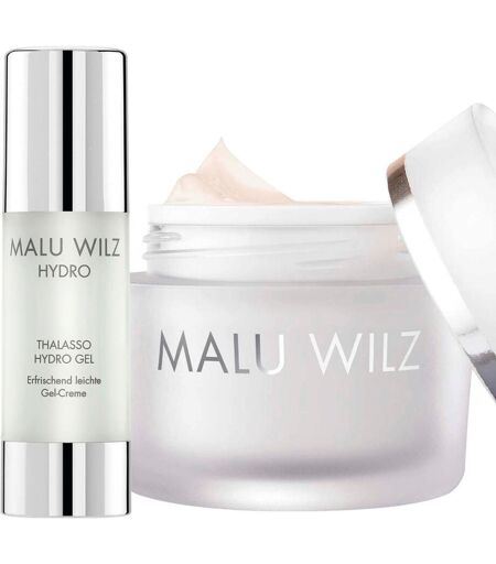 Le Malu Wilz Thalasso Set contient : 1 x Malu Wilz Thalasso Hydro Gel, 30 ml1 x Malu Wilz Thalasso Vital Treatment, 50 ml Malu Wilz Thalasso Hydro Gel : des extraits d'algues spéciaux et de l'acide hyaluronique hydratent intensément et redonnent rapidement une fraîcheur juvénile. De plus, le beurre de cupuaçu tropical préserve la peau d'une nouvelle déshydratation et lui confère une souplesse durable. Malu Wilz Thalasso Vital Treatment : Crème onctueuse avec une combinaison hautement efficace d'extraits d'algues de l'Atlantique, de beurre de cupuaçu tropical et d'acide hyaluronique. Forme un réseau de substances actives hydratantes sur la peau et procure une sensation de soin unique. La texture de haute qualité combat les ridules de sécheresse et offre à votre teint une fraîcheur vivifiante et une nouvelle vitalité. ...