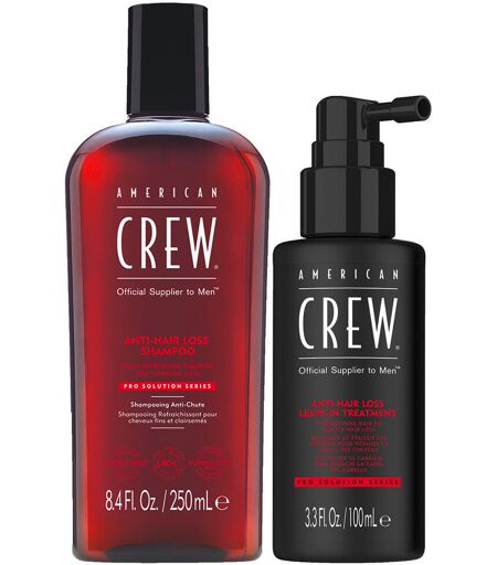 Le kit anti-chute American Crew contient : American Crew ANTI-HAIR LOSS SHAMPOO Scalp Refreshing Shampoo For Thinning Hair, 250 mlAmerican Crew Pro Solution ANTI-HAIR LOSS LEAVE-IN TREATMENT, 100 ml ANTI-HAIR LOSS SHAMPOO Scalp Refreshing Shampoo For Thinning Hair : Le shampooing anti-chute d'American Crew tonifie le cuir chevelu, favorise le volume et le démêlage. Il nettoie les pores en profondeur et améliore l'état du cuir chevelu. Il est composé à 80% d'ingrédients d'origine naturelle. Des ingrédients hautement efficaces préviennent la casse des cheveux et leur chute. Le shampooing contient une formulation avec des acides aminés de kératine et des protéines végétales. Réduit la casse des cheveux de 80%.Les cheveux ont plus de corps.Renforce les cheveux de la racine jusqu'aux pointes.Les cheveux ont un aspect sain. Utilisation : appliquer une petite quantité de produit sur les cheveux et le cuir chevelu en massant. Rincer soigneusement. Vous obtiendrez les meilleurs résultats si vous utilisez ensemble le shampooing et le soin du cuir chevelu de la ligne Anti-Hair Loss d'American Crew. ANTI-HAIR LOSS LEAVE-IN TREATMENT : Traitement fortifiant du cuir chevelu sans rinçage, qui renforce les cheveux et leur donne plus de corps. La formule rend les cheveux plus épais et prévient la casse. Cette formule rapidement absorbée n'alourdit pas les cheveux. La ligne Anti-Hair Loss d'American Crew est une gamme de produits hautement efficaces qui aide à réduire la casse des cheveux. En outre, elle donne du volume et assure un cuir chevelu plus sain. Un parfum frais & pur d'agrumes et de menthe qui s'ouvre sur des notes pétillantes d'écorce d'orange et de citron vert et qui est complété par de la menthe verte et de la menthe poivrée. Formulé avec des acides aminés de kératine et des protéines végétales. Application : Les meilleurs résultats sont obtenus en vaporisant le traitement sur le cuir chevelu et en le massant, ainsi qu'en utilisant la combinaison de shampooing et de soin du cuir chevelu de la ligne Anti-Hair Loss d'American Crew ensemble. ...