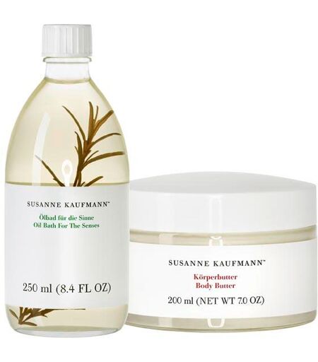 Le duo de soins corporels Susanne Kaufmann Wellness comprend : 1 x bain d'huile pour les sens de Susanne Kaufmann, 250 ml 1 x beurre corporel Susanne Kaufmann, 200 ml Le bain d'huile pour les sens de Susanne Kaufmann : Le bain d'huile pour les sens à base d'huiles précieuses de l'ylang-ylang, du patchouli et de la lavande est une expérience relaxante et aphrodisiaque après une journée fatigante. Les huiles naturelles dorlotent et soignent le corps de manière luxueuse. Les huiles luxueuses améliorent l'humeur et laissent la peau agréablement lisse. Application : 30 ml donnent un bain complet, luxueux et attentionné. Beurre corporel Susanne Kaufmann : Le beurre corporel dorlote la peau grâce à une combinaison de beurre de karité et d'huile d'olive de haute qualité. Le précieux miel qu'il contient est particulièrement adapté aux peaux qui ont tendance à se dessécher. Le beurre corporel intensif est particulièrement riche et apporte un soin durable aux peaux rugueuses ou fragiles. Le beurre corporel est absorbé particulièrement rapidement et laisse une sensation de velouté sur la peau. Convient également à la peau des enfants. Peut être appliqué plusieurs fois par jour sur les zones particulièrement rugueuses des genoux et des coudes. Mode d'emploi : Appliquer sur tout le corps après la douche, le bain ou le bain de soleil. La ligne de cosmétiques porte son nom : Susanne Kaufmann. Elle représente donc un message et une conviction personnels qui peuvent être ressentis dans chaque produit. Ses produits témoignent d'une foi dans la puissance de la nature, d'une conscience prononcée de la qualité et d'un engagement clair en faveur de la durabilité. L'emballage minimaliste en verre ou en plastique recyclé contient non seulement de précieux actifs cosmétiques naturels issus du monde végétal du Bregenzerwald, mais démontre également la foi de Susanne Kaufmann dans la durabilité et le naturel. Cela se reflète également dans la fabrication des produits. ...