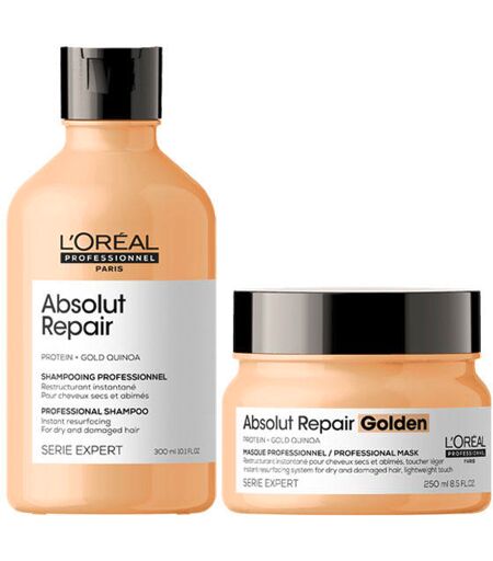 Le coffret Duo Serie Expert Absolut Repair Care de L'ORÉAL contient.. : 1 x L'ORÉAL Serie Expert Absolut Repair Shampoo, 300 ml1 x L'ORÉAL Serie Expert Masque d'Or Réparateur Absolu, 250 ml L'ORÉAL SERIE EXPERT ABSOLUT REPAIR SHAMPOO : Le shampooing Absolut Repair de L'Oréal Professionnel Paris a été spécialement développé pour les cheveux abîmés et secs. Enrichie en quinoa doré et en protéines, la formule professionnelle aide à restructurer et à réparer les cheveux sans les alourdir. Associé à l'Absolut Repair Conditioner, les cheveux sont plus brillants, plus lisses et la surface des cheveux est moins endommagée. Application : Appliquer sur les cheveux humides, faire mousser, rincer. L'ORÉAL SERIE EXPERT ABSOLUT REPAIR GOLDEN MASK : Le masque Absolute Repair Gold de L'Oréal Professionnel Paris est spécialement formulé pour les cheveux endommagés et secs. Enrichie en quinoa doré et en protéines, la forme professionnelle aide à restructurer et à réparer les cheveux par un conditionnement en profondeur sans les alourdir. Grâce à sa texture dorée, le masque donne aux cheveux stressés une belle brillance. Les cheveux deviennent plus lisses, plus brillants et la surface des cheveux est réparée. Application : Appliquez sur les cheveux lavés et séchés à la serviette et laissez agir pendant 3 à 5 minutes, puis rincez abondamment. ...
