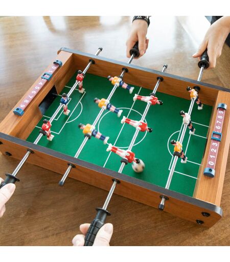 Baby-foot de table; Six joueurs par équipe (un gardien de but compris); Trois joueurs sont montés sur chacune des quatre barres (2 barres par joueur)); Tous les éléments et outils sont fournis (clé à six pans); Facile à monter; Tableau d’affichage à chaque bout; Deux ballons sont fournis; Les ballons peuvent être remis en jeu après chaque but (une caractéristique distinctive par rapport aux baby-foot ordinaires); Revêtement avec veinure en bois; Les couleurs des joueurs peuvent varier/différer de la photo; Convient à tous ceux qui ont plus de quatre ans (les petites pièces peuvent être avalées, faites attention !); Dimensions : 51 x 39 x 11 centimètres (une fois monté); ...