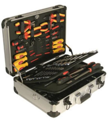 Outillage professionnel - Tout à portée de main - L'outillage est rangé de manière professionnelle sur les plateaux par des sangles de maintien élastiques, avec dessin en arrière plan (chaque chose à sa place) ou dans des compartiments mousse préformés Plateau 1 : Pince universelle 160 mm VDE Pince à becs plats 160 mm VDE Pince coupante 160 mm VDE Pince à dénuder 160 mm VDE Pince pompe à eau 250 mm Tournevis plat: 6 x 38 mm Tournevis cruciforme court: PH 2 x 38 mm Testeur de tension 100-250 V Testeur de phase Tournevis plat: 3,5 x 75, 5,5 x 125, 6,5 x 150 mm Tournevis cruciforme: PH 0 x 75, 1 x 80, 2 x 100 mm Plateau 2 : Clé Allen : 1 - 10 mm Clé à fourche : 8 - 22 mm Plateau 3 : Marteau en plastique 400 mm Marteau 300 g Limes en acier 200 mm 3 pcs. Crayons de menuisier 2x Burin pointu 250 mm Burin plat: 50 x 200 mm, 22 x 250 mm Tournevis avec porte-embout 1/4 " Plateau 4 : Cliquet ½ "et ¼" à dents fines Écrou de bougie: ½ "16 & 21 mm Douilles: ½ '', 14 - 32 mm; ¼ ", 4 - 13 mm Joint ...
