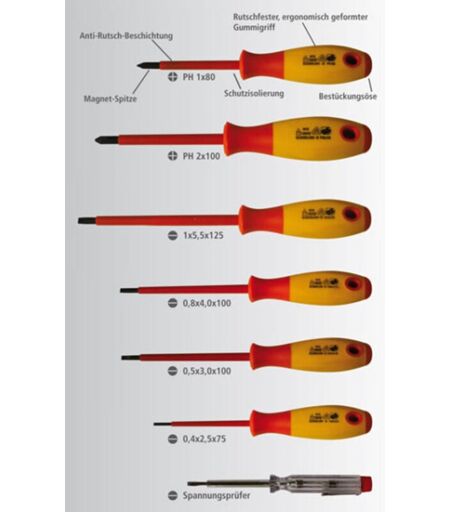 Revêtement antidérapant Embout magnétique Isolation Poignée antidérapante Oeillet d'accroche 1 tournevis testeur PH 1 x 80 2 x 100 PH 0,4 x 2,5 x 75 0,5 x 3 x 100 0,8 x 4 x 100 1 x 5,5 x 125 L'article livré peut différer légèrement de celui représenté sur la photo mais celui-ci sera en tout point conforme au descriptif ...