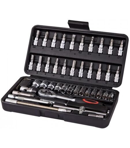 3x clés Allen : 1,5 / 2 / 2,5 mm Douilles : 4 / 4,5 / 5 / 5,5 / 6 / 7 / 8 / 9 / 10 / 11 / 12 / 13 / 14 mm Embouts/hexagonaux : V3, V4, V5, V6, V7, V8 Embouts/croix : PH1, PH2, PH3, PZ1, PZ2, PZ3 Embouts/plat : V4, V5.5, V7 Equipement : Poignée anti-dérapante Cliquet contrôlé par un sélecteur rotatif droite/gauche Livré dans une mallette pratique en plastique 1x cardan 2x rallonges 1x rallonge flexible 1x poignée en T 1x adaptateur 1x cliquet 13 douilles 1/4" de 4 à 14 mm 21 embouts (Torx - PZ - PH - tournevis plat - 6 pans) Acier au chrome vanadium de haute qualité L'article livré peut différer légèrement de celui représenté sur la photo mais celui-ci sera en tout point conforme au descriptif ...