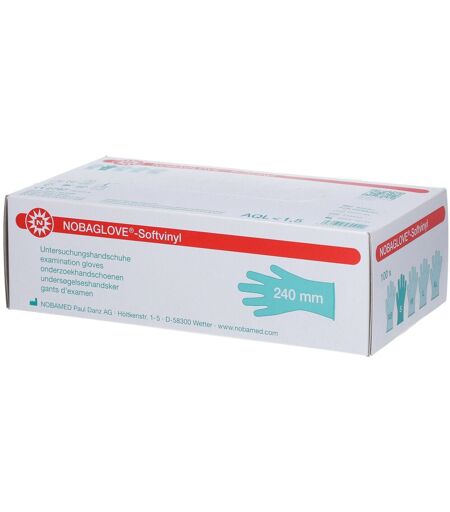 Gants en vinyle NOBAGLOVE®, taille S Les gants jetables non poudrés et non stériles en vinyle spécial sont adaptés à la protection contre les germes pathogènes en médecine, en soins infirmiers ou en laboratoire. Les gants sont fabriqués dans un matériau en vinyle modifié qui présente une élasticité accrue. Les gants sont de couleur jaune. Ils sont conformes à la norme EN 455 partie 1-4. 100 gants sont fournis par paquet. Dimensions Taille S. 240 mm. ...