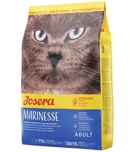 Les chats sont de véritables petits gourmets et peuvent parfois s'avérer très exigeants. Certains chats ont un système digestif sensible ou bien souffrent d'intolérances envers certains ingrédients. Les croquettes Josera Marinesse constituent une nourriture équilibrée et hypoallergénique particulièrement appréciée et tolérée par les chats sensibles et exigeants. Ces croquettes ne contiennent pas de céréales mais des pois et des pommes de terre qui constituent de bonnes sources de glucides.... ...