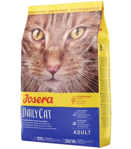Les croquettes Josera DailyCat offriront à votre chat un aliment tout aussi savoureux que nutritif à la composition équilibrée. Elles sont très riches en volaille et ont une forte teneur en protéines animales. Ces croquettes ne contiennent pas de céréales et conviennent parfaitement aux chats souffrant d'allergies et d'intolérances alimentaires. Elles sont produites en Allemagne selon des normes de qualité élevées : seuls des ingrédients de qualité sont utilisés. Elles contiennent des herbes,... ...