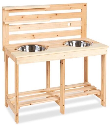 Solide: sapin, non trait?. L 90 cm, P 44 cm, H 94 cm. Hauteur du plan de travail 58 cm. 2 vasques en acier inoxydable. Passage pour tuyau d'arrosage dans le mur du fond. Avec impression slush cuisine. Recommand? pour les enfants ? partir de 3 ans. Livr? sans accessoires. ...