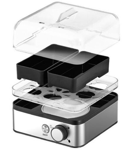 Cuiseur à oeufs CASO E9. Cuire des ?ufs à votre goût n'a jamais été aussi simple avec le cuiseur à oeufs E9 2771 de Caso : ?ufs durs, mollets ou coques, à vous de choisir !Performances :Le cuiseur à ?ufs Caso d'une puissance de 400 Watts, peut cuire jusqu'à 8 ?ufs durs, pocher jusqu'à 4 ?ufs, cuire 2 petites omelettes... en une seule tournée !La plaque chauffante de l?appareil est dotée d?un revêtement anti-adhésif pour un entretien aisé.Praticité : Le contrôle électronique du temps de cuisson vous offre une maîtrise parfaite de vos préparations. Pour cela, vous disposez d'une molette avec 3 positions possibles : coque/mollet/dur.De plus, l'appareil intègre un système d' arrêt programmé afin d'éviter le dessèchement des aliments ainsi que les mauvaises odeurs.Utilisation :Lorsque vos ?ufs sont cuits, un signal sonore vous prévient de la fin de cuisson.Le couvercle transparent est idéal pour avoir une bonne visibilité durant la cuisson. Bouton On / Off.Accessoires :Le cuiseur à ?ufs est livré avec un gobelet mesureur avec perce-?uf et un support à ?ufs.Design :Sa base en inox et son affichage LED lui confère un design moderne et élégant. - Capacité (en nombre d'oeufs) : 8. Sans fil : Non. Puissance : 400 W. Resistance : Cachée. Arrêt automatique : Oui. Couvercle : Oui. Socle connecteur 360° : Non. Appareil connecté : Non. Information(s) complémentaire(s) : Contrôle électronique du temps de cuisson. Dimensions : L(17,1) x H (16,4) x P (17,1) cm. Poids : 1,05 kg. ...