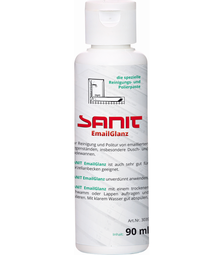 Sanit EmailGlanz 3039, 90 ml Nettoyant spécial pour toutes les surfaces émaillées et pièces en céramique. Nettoie en douceur et laisse un éclat radieux. Enlève les Céramique de salle de bain métalliques sur le Céramique de salle de bain . De légères rayures peuvent être polies. ...