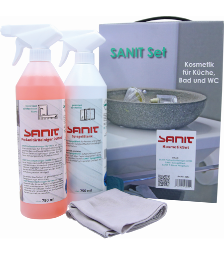 set de cosmétiques Sanit 3254 Reinigung parfaite de produits pour le Reinigung professionnel dans la cuisine, Salle de bains et WC L'ensemble cosmétique SANIT contient les produits suivants: SANIT ProSanitary Cleaner DU 100 (750 ml avec tête de pulvérisation) • Blank miroir SANIT (750 ml avec tête de pulvérisation) • Chiffon d'entretien 7 étoiles Zone d'application: pour la zone Sanit complète, coin cuisine ...