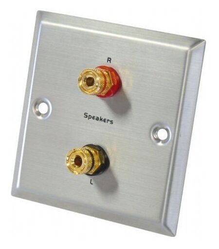 DYNAVOX - PRISE MURALE POUR HAUT-PARLEURS - 2 BORNIERS POUR FICHES BANANE - ACIER INOXYDABLE - 2 contacts, fiches bananes dorées repérées. Acier mat Brossé. Montage mural. Li? Voir la présentation ...