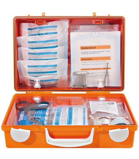 Mallette de premiers secours SAN / assortiment de recharge - Plastique ABS - Joint en caoutchouc - Plaques de recouvrement transparentes - Division intérieure variable par des séparateurs, pouvant être scellés - 147 pièces - Contenu DIN 13157 Fourniture : Y compris 1 joint et un support mural avec blocage à 90 °. ...