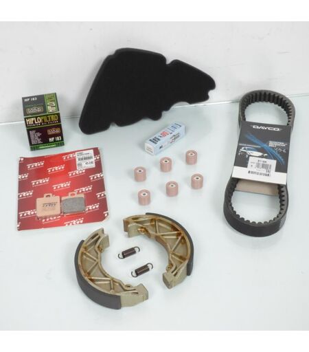 Kit révision entretien neuf de marque Sceed42. Ce kit comprend: - Bougie d'allumage NGK CR7EB - Filtre a air Cif 11764 - Filtre a Huile Hiflofiltro HF183 - Galet rouleau de variateur Leovince 6643 (19x17mm x 8.5grs) - Courroie de transmission Dayco 8118K (22.5x814) - Plaquette de frein avant TRW MCB827SRM - Mâchoire de frein arrière TRW MCS994 Ce kit révision permet d'effectuer la révision standard du scooter. Il contient uniquement ce qui est visible sur la photo. Livre conforme a la photo. ...