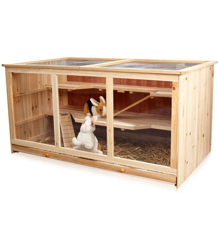 Description générale Découvrez notre cage pour rongeurs, la villa parfaite pour votre hamster, souris ou tout autre petit animal ! Cette cage spacieuse et confortable est conçue pour offrir à votre animal de compagnie un habitat sûr, fabriquée à partir de matériaux de haute qualité, elle est robuste et durable. Spécifications techniques Dimensions extérieures : env. 117 cm x 63 cm x 58 cm (L x l x H) Dimensions intérieures : env. 114 cm x 60 cm x 56 cm (L x l x H) Matériau : bois d'épicéa, fil de fer barbelé renforcé et plexiglas Convient à tous les rongeurs - lapins, cochons d'Inde, hamsters, souris, rats et autres Montage facile Stabilité sûre Trois étages reliés par des entretoises en bois Tiroir amovible pour un nettoyage facile Couvercle rabattable inclus Compatibilité et accessoires Accessoires inclus : roue d'exercice, maisonnette et abreuvoir Offre de nombreuses possibilités d'aménagement pour le confort de votre animal Installation Le montage de la cage est simple et rapide, ...