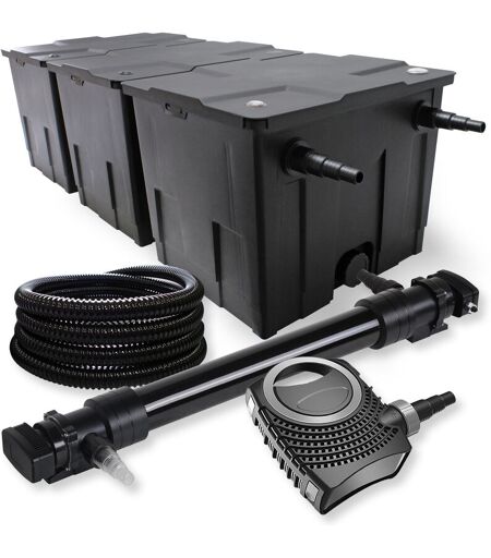 [Clarté de l’eau pour les grands bassins] - Filtre de bassin bio SunSun CBF-350C, 90 000 L, système à 3 chambres, facile à utiliser, pour une eau de bassin cristalline et des habitants en bonne santé. [Réduction de germes efficace] - Clarificateur de bassin UV élimine bactéries, germes pathogènes et algues flottantes, assure une eau claire et favorise la santé des poissons et des plantes. [Pompe de bassin SunSun NEO-10000 SuperECO] - Débit de 10000 l/h pour une puissance absorbée de seulement 80 W. Le boîtier de la pompe s’ouvre sans outils, ce qui facilite le nettoyage et l’entretien. [Tuyau spiralé résistant aux UV 25 mm] - Tuyau en PVC de 25 m avec spirale de renfort, flexible et robuste. Acheminement d’eau sans problème même pour les projets sophistiqués. Ce kit de filtration de bassins assemblé tout spécialement pour les grands et moyens bassins jusqu'à 90000l vous offre les accessoires pour votre bassin. Malgré son type de construction compact, le filtre biologique SunSun ...