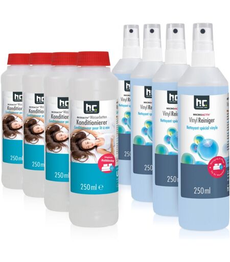 Kit d'entretien pour lit à eau avec 4 x 250 ml de conditionneur & 4 x 250 ml de nettoyant pour vinyle Avec ce kit, vous pouvez entretenir votre lit à eau de manière fiable et le protéger contre les moisissures et les germes. Conditionneur pour lits à eau Le conditionneur pour lit à eau BAYZID ® empêche de manière fiable la prolifération des bactéries, des champignons et des algues au cœur de votre matelas à eau et entretient le vinyle de l'intérieur. Mais la formation gênante de bulles et le bouillonnement de l'eau appartiennent également au passé grâce aux additifs inhibiteurs d'air qui fixent l'oxygène. Dosage et utilisation du conditionneur pour lits à eau Lors de l'utilisation du conditionneur Microactiv® pour lits à eau, il est possible d'utiliser soit un flacon entier après environ 12 mois, soit la moitié du produit en cas de changement d'eau précoce tous les 6 mois. Une bouteille entière suffit pour un matelas d'eau d'un volume de remplissage allant jusqu'à 400 litres. ...