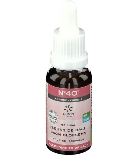 Complément alimentaire à utiliser dans le cadre d’une alimentation variée, équilibrée et d’un mode de vie sain.Mélange de Fleurs de Bach Original BIO sous forme de gouttesCherchez votre équilibre et vivez votre journée avec intensité et enthousiasme.Le mélange Original N°40 contient les 4 Fleurs de Bach suivantes: Wild Rose Fleur de la joie de vivre Olive Fleur de la guérison intérieure Hornbeam Fleur du dynamisme Elm Fleur de l’harmonie intérieureLes Gouttes liquides N°40 ÉNERGIE contiennent 4 essences des Fleurs de Bach selon Dr. Bach, conservées dans un Brandy Bio. En qualité bio certifiée Dilution originale: 1 : 240 Méthode de préparation originale (soleil et cuisson) Production soigneuse, durable et non industrielle Particulièrement approprié pour une application à domicileComposition:Brandy* (27% Vol.), essences de Fleurs de Bach Original*: églantier*, olivier*, charme*, orme* (* Issus de culture biologique)Conseil d'utilisation:Diluer trois à quatre gouttes dans un verre d’eau et le boire à gorgées. Alternativement, verser les Fleurs de Bach non diluées directement sur la langue.Précautions d'emploi:En raison de la présence d’alcool, déconseillés aux femmes enceintes et allaitantes.Poids net: 20 mlFabricant: Eureka Pharma Harelbeeksestraat 81 8520 Kuurne ...