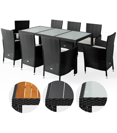 Casaria Salon de jardin 17 pièces en polyrotin noir - 8 Chaises empilables 1 Table avec plateau en verre - 8 Coussins beige