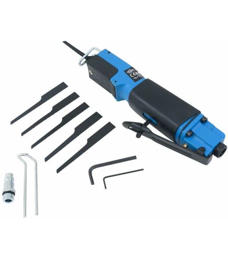 Scie à métaux pour travail sur le métal! Ave cette scie à métaux pour carrosserie pratique, découpez de façon propre et précise l'acier, l'aluminium et le plastique - Les 8.500 coups par minute permettent une coupe précise. Avec le support d'arrêt réglable, vous pouvez contrôler la profondeur de coupe de façon optimale. Les 6 lames de scie et les 2 clés Allen incluses dans la livraison offrent de nombreuses possibilités . Grâce au design moderne matte et à son revêtement solide, la scie résiste aux rayures et à la saleté . La poignée en caoutchouc assure une tenue stable et sûre. Grâce à sa fabrication robuste et maniable, vous pourrez scier facilement et sans effort. Scie à métaux pneumatique - 6x lames de scie - 2x clés Allen - 2x supports d'arrêt - 1x raccord d'air Avantages du produit: - Idéal pour l'acier, l'aluminium et le plastique - Coupe propre et précise - Poignée caoutchouté pour une tenue plus stable - Support d'arrêt réglable pour un contrôle de profondeur de coupe ...
