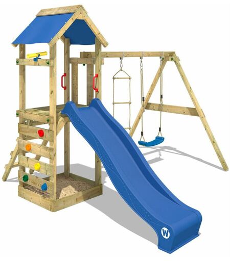 Wickey - Aire de jeux Portique bois FreeFlyer avec balançoire et toboggan bleu Maison enfant exterieur avec bac à sable, échelle d'escalade &