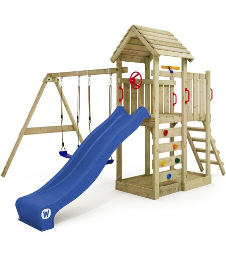 Wickey - Aire de jeux MultiFlyer - Toit en bois - Balançoire - Toboggan - Maison enfant extérieur - Bac à sable - Échelle d'escalade - Accessoires de