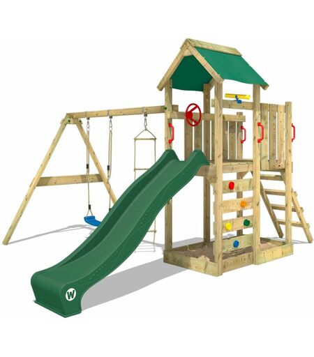 Wickey - Aire de jeux Portique bois MultiFlyer avec balançoire et toboggan Maison enfant exterieur avec bac à sable, échelle d'escalade & accessoires