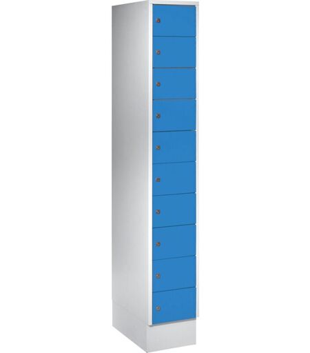 Vestiaire multicases pour objets de valeurs, 1 compartiment, gris clair / bleu clair, 10 casiers. Produit livré = monté. Nombre de compartiments = 1 pces. Modèle de piétement d'armoires-vestiaires = avec socle. Coloris corps = gris clair RAL 7035. Coloris porte = bleu clair RAL 5012. Verrouillage = serrure à cylindre de sécurité, clés différentes par serrure. Version = forme de toit plate. Hauteur = 1850 mm. Largeur = 300 mm. Profondeur = 500 mm. Série = armoires spécialisées. Nombre de casiers = 10 pces. Equipement intérieur = sans équipement intérieur. Angle d'ouverture des portes = 110 °. Largeur compartiments = 300 mm. Hauteur intérieure = 175 mm. Largeur intérieure = 298 mm. Profondeur intérieure = 475 mm. Hauteur du socle = 100 mm. Matériau = tôle d'acier. Surface = peinture cuite au four. Epaisseur matériau = 0,75 mm. Type de porte = porte battante. Construction = soudée. Nombre de clés = 2 pces. Aération par perforations dans la paroi arrière. Casiers sans équipement ...
