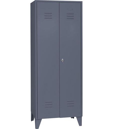 Armoire pour produits de nettoyage Berlin 2, 4 tablettes, 1 support de serrage, gris bleu RAL 7031. Produit livré = monté. Série = BERLIN. Modèle de piétement d'armoires-vestiaires = avec pieds. Coloris corps = gris bleu RAL 7031. Coloris porte = gris bleu RAL 7031. Verrouillage = loqueteau de sécurité pour cadenas. Hauteur = 1850 mm. Largeur = 700 mm. Profondeur = 500 mm. Equipement intérieur = à gauche: 4 tablettes fixes, à droite: 1 support pour ustensiles à manche long. Angle d'ouverture des portes = 110 °. Largeur compartiments = 350 mm. Hauteur intérieure = 4x307 / 1670 mm. Largeur intérieure = 2x348 mm. Profondeur intérieure = 475 mm. Hauteur pied = 150 mm. Matériau = tôle d'acier. Surface = peinture cuite au four. Epaisseur matériau = 0,75 mm. Type de porte = porte battante. Construction = soudée. Nombre de clés = 2 pces. Type de produit = armoires de ménage. Aération par perforations dans la paroi arrière. Construction en tôle d'acier soudée, peinture cuite au four. Fentes ...