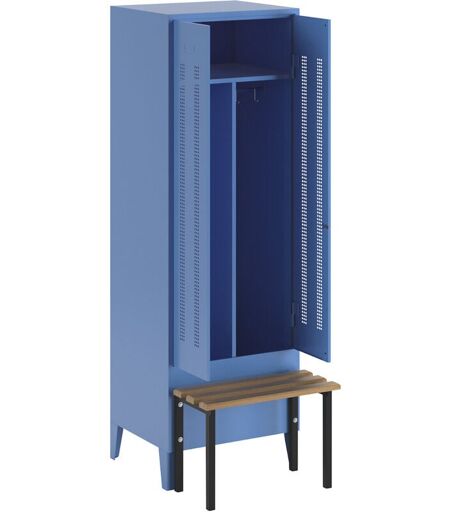 Vestiaire linge propre/linge sale Berlin 1 avec banc, 1 compartiment, bleu clair, l 600 mm, monté devant, bois de hêtre. Produit livré = monté. Série = BERLIN. Nombre de compartiments = 1 pces. Coloris corps = bleu clair RAL 5012. Coloris porte = bleu clair RAL 5012. Verrouillage = loqueteau de sécurité pour cadenas. Version = avec banc monté devant. Matériau assise = hêtre. Hauteur = 1850 mm. Largeur = 600 mm. Profondeur = 805 mm. Profondeur compartiments = 500 mm. Equipement intérieur = 1 tablette supérieure, 1 tringle avec 6 patères, 1 cloison médiane fixe. Hauteur compartiments = 1850 mm. Largeur compartiments = 600 mm. Hauteur intérieure = 250 / 1420 mm. Largeur intérieure = 2x298 mm. Profondeur intérieure = 475 mm. Hauteur assise = 415 mm. Profondeur assise = 300 mm. Coloris du piétement = noir foncé RAL 9005. Hauteur pied = 150 mm. En tôle d'acier robuste soudée et renforcée. Verrouillage par cadenas (pour anse d'épaisseur max. 6 - 8 mm). Grilles pour chaussures pouvant être ...