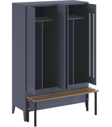 Vestiaire linge propre/linge sale Berlin 1 avec banc, 2 compartiments, gris bleu, l 1200 mm, monté devant, bois de hêtre. Produit livré = monté. Série = BERLIN. Nombre de compartiments = 2 pces. Coloris corps = gris bleu RAL 7031. Coloris porte = gris bleu RAL 7031. Verrouillage = loqueteau de sécurité pour cadenas. Version = avec banc monté devant. Matériau assise = hêtre. Hauteur = 1850 mm. Largeur = 1200 mm. Profondeur = 805 mm. Profondeur compartiments = 500 mm. Equipement intérieur = 1 tablette supérieure, 1 tringle avec 6 patères, 1 cloison médiane fixe. Hauteur compartiments = 1850 mm. Largeur compartiments = 600 mm. Hauteur intérieure = 250 / 1420 mm. Largeur intérieure = 2x298 mm. Profondeur intérieure = 475 mm. Hauteur assise = 415 mm. Profondeur assise = 300 mm. Coloris du piétement = noir foncé RAL 9005. En tôle d'acier robuste soudée et renforcée. Verrouillage par cadenas (pour anse d'épaisseur max. 6 - 8 mm). Grilles pour chaussures pouvant être installées ultérieurement ...