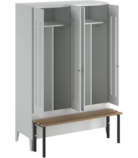 Vestiaire linge propre/linge sale Berlin 1 avec banc, 2 compartiments, gris clair, l 1200 mm, monté devant, bois de hêtre. Produit livré = monté. Série = BERLIN. Nombre de compartiments = 2 pces. Coloris corps = gris clair RAL 7035. Coloris porte = gris clair RAL 7035. Verrouillage = loqueteau de sécurité pour cadenas. Version = avec banc monté devant. Matériau assise = hêtre. Hauteur = 1850 mm. Largeur = 1200 mm. Profondeur = 805 mm. Profondeur compartiments = 500 mm. Equipement intérieur = 1 tablette supérieure, 1 tringle avec 6 patères, 1 cloison médiane fixe. Hauteur compartiments = 1850 mm. Largeur compartiments = 600 mm. Hauteur intérieure = 250 / 1420 mm. Largeur intérieure = 2x298 mm. Profondeur intérieure = 475 mm. Hauteur assise = 415 mm. Profondeur assise = 300 mm. Coloris du piétement = noir foncé RAL 9005. En tôle d'acier robuste soudée et renforcée. Verrouillage par cadenas (pour anse d'épaisseur max. 6 - 8 mm). Grilles pour chaussures pouvant être installées ...
